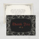 These 5" x 3.5" wedding thank you cards feature a goth style with black and bone faux lace on weathered paper with mocha and blood red text. The back the same weathered paper and border as the front with placeholders for the married couple names, salutation and an optional message.