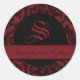 Red and black damask print with grunge effect and monogram Gothic wedding label.