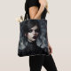 Tote bag features oil painting artwork of a goth young woman in black Victorian era fashion. She is striking, with an intense gaze directed at viewer. Her look could also be seen as witchy or vampiric. Abstract textured background in various shades of grey and other neutral colours.