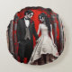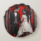 The image depicts a gothic couple dressed in wedding attire standing under an archway. The background is dramatically painted in shades of red, evoking a sense of blood splatter, which adds a dark and eerie atmosphere to the scene. The groom is wearing a black suit with a red boutonniere, and his hair is styled in a sleek, gothic manner. The bride is in a white dress adorned with intricate patterns, her long dark hair complementing the gothic theme. Both characters have pale complexions and an ethereal presence, further emphasizing the gothic aesthetic. The overall mood is a blend of romance and macabre, characteristic of gothic art.
