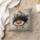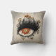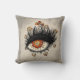 Weird eye pillow with a digital illustration of a female eye with broken iris made of lava and long eyelashes ending in bizarre flowers with angled petals in a cloudy grey sky.
