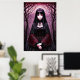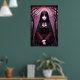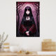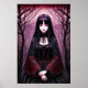 A portrait of a anime gothic girl with long black hair with a black and red dress standing in a dark forest. This is a AI generated art.