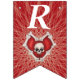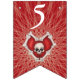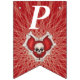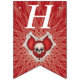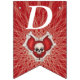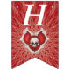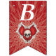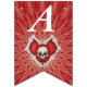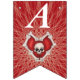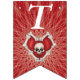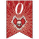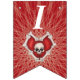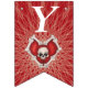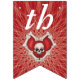 This flag shaped bunting Happy Birthday banner is deep red with a spiral line pattern and a Gothic red heart bordered in white bones with a skull in the centre. Customise the birthday year with the templates.