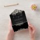 All in one gothic wedding invitation featuring black and white roses florals and string lights falling across elegant typography. The invitation includes a perforated RSVP card that features your wedding website QR code and details. Designed by Thisisnotme©