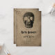 This gothic black skull head baby shower invitation design features a vintage spooky Halloween goth style typography on a brown old fashioned antique style grunge paper background. Image copyright Marg Seregelyi Photography.
