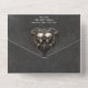 AVAILABLE WITH OR WITHOUT A QR CODE TO SCAN IN THE RSVP AREA OR WITH OR WITHOUT DINNER OPTIONS. Embrace the mysterious allure of your special day with this vintage inspired design. A distressed charcoal black background sets the stage for a celebration that transcends time. The antique-inspired white text whispers promises of everlasting devotion, while a Gothic-style black and white filigree heart reigns supreme at the top, cradling two smiling gold skulls in mesmerising three-dimensional relief. This invitation is more than a mere announcement; it's a captivating masterpiece that reflects the unique union of two souls. Invite your guests to share in the enchantment of your love story with this extraordinary blend of vintage charm and Gothic romance. Unveil the magic, and let your love story unfold in the shadows of elegance and mystery. Created by Simply Farmhouse Press.