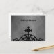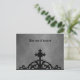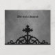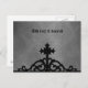 Elegant gothic post card with a wrought iron medieval cross gate topper silhouette at the bottom against a grungy fine damask background in black and gray tones. The text at the top is easily removable or changable.