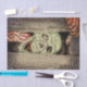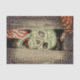 Gothic, creepy, green goth Halloween skull head peaking through wood craft decoupage tissue paper. Image copyright Marg Seregelyi Photography.