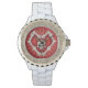 This wrist watch has a Gothic dark red heart that is outlined with white bones and a white skull in the centre of the heart on a red background with white spiral lines.