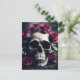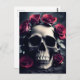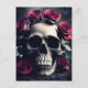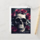 A dark and gothic painting of a human skull surrounded by pale gothic roses and petals, featuring a creepy desaturated gothic atmosphere and otherworldly atmosphere, this postcard is perfect for lovers of dark gothic skulls and dark romantic gothic flowers and roses.