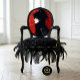 The headpiece is a standout feature, composed of a multitude of black feathers that radiate outward, creating a sense of movement and dynamic energy. The feathers are meticulously arranged to provide both volume and texture, giving the headpiece a bold and dramatic silhouette. The rich black colour of the feathers contrasts starkly with the model's pale skin and the vibrant red backdrop, creating a visually compelling composition.