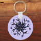Gothic floral keychain with a cool weird mandala illustration - digitally coloured ink drawing of a strange flower with reptile monsters with sharp teeth in black, violet and blue colours.