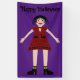 This awesome Halloween banner features a digital art image of a creepy but beautiful Halloween Vampiress. The female vampire has long spiky black hair and is wearing a red dress adorned with a spider and decorated with black skulls, stars, diamonds and pair of black swans. She has bright red lips covered in lipstick and a sultry smile and long white fangs. She also has black fingernails, a blood red bracelet of rubies and black high heel boots with gold bows on them. Her arms are open welcoming you for an evil embrace. There is custom text so you can personalise it however you like.