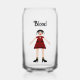 This awesome can glass features a digital art image of a creepy but beautiful Halloween Vampiress. The female vampire has long spiky black hair and is wearing a red dress adorned with a spider and decorated with black skulls, stars, diamonds and pair of black swans. She has bright red lips covered in lipstick and a sultry smile and long white fangs. She also has black fingernails, a blood red bracelet of rubies and black high heel boots with gold bows on them. Her arms are open welcoming you for an evil embrace. There is custom text so you can include your own message. The default message reads "blood"