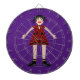 This awesome dart board features a digital art image of a creepy but beautiful Halloween Vampiress. The female vampire has long spiky black hair and is wearing a red dress adorned with a spider and decorated with black skulls, stars, diamonds and pair of black swans. She has bright red lips covered in lipstick and a sultry smile and long white fangs. She also has black fingernails, a blood red bracelet of rubies and black high heel boots with gold bows on them. Her arms are open welcoming you for an evil embrace.