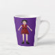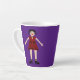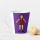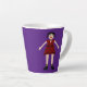 This awesome latte mug features a digital art image of a creepy but beautiful Halloween Vampiress. The female vampire has long spiky black hair and is wearing a red dress adorned with a spider and decorated with black skulls, stars, diamonds and pair of black swans. She has bright red lips covered in lipstick and a sultry smile and long white fangs. She also has black fingernails, a blood red bracelet of rubies and black high heel boots with gold bows on them. Her arms are open welcoming you for an evil embrace.