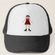 This awesome hat features a digital art image of a creepy but beautiful Halloween Vampiress. The female vampire has long spiky black hair and is wearing a red dress adorned with a spider and decorated with black skulls, stars, diamonds and pair of black swans. She has bright red lips covered in lipstick and a sultry smile and long white fangs. She also has black fingernails, a blood red bracelet of rubies and black high heel boots with gold bows on them. Her arms are open welcoming you for an evil embrace.