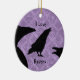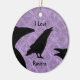 3 raven silhouettes in black on a purple goth damask background and printed on a customisable ornament that reads "I love ravens". The wording can be removed or changed easily.