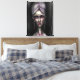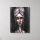 Spooky gothic decor. A gothic painting of a pale ghostly woman with redness under her eyes and pouting red lips. Her eyes are dark and sunken, and seem to hold a dark, tragic story. Her hair is carefully coifed in an elegant updo. Tendrils of pale grey hair frame her face, against a dark and ominous black background.