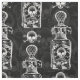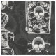 A collage of vintage images including skulls, flowers, and a fancy perfume bottle forms this pretty gothic black and white poison bottle pattern.