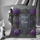 Announce your wedding plans in style with this gothic themed save the date flat card featuring purple roses on a fancy grey frame and your names, wedding date and photo on the back to personalise. Designed by Susan Coffey. Images generated with AI.