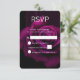 A gothic wedding RSVP card with a close-up image of a gothic looking purple magenta rose. A dark and mysterious style.