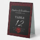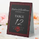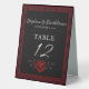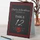 For your Gothic wedding the perfect table numbers. It is designed to be elegant and mysterious. The Design features red and black damask and a red, bloody rose. The font is in a delicate, almost white shade of gray that contrasts with the dark background. At the bottom there is a bleeding red rose, giving a mysterious and slightly dark touch. The rose symbolizes love and passion while the blood represents the depth of emotions. Overall, it exudes a certain drama and intensity that immediately attracts the attention of everyone. It's perfect for couples looking for an unconventional and unique wedding.