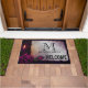 A welcome doormat with a gothic look. An old greying parchment paper with hints of purple-red around the edges. A magenta rose in full bloom, a rosebud, and candle on a dark burgundy background creates a beautiful, dark and mysterious gothic design. Personalise with your monogram letter and name.