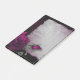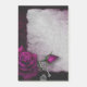 Large post-it notes with a gothic look. An old greying parchment paper with hints of purple-red around the edges. A magenta rose in full bloom, a rosebud, a candle, and silver locket on a dark burgundy background creates a beautiful, dark and mysterious gothic design.
