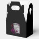 Wedding favour box with a gothic look. An old greying parchment paper with hints of purple-red around the edges. A magenta rose in full bloom, a rosebud, a candle, and silver locket on a dark burgundy background creates a beautiful, dark and mysterious gothic design.