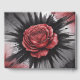 A symmetrical floral design featuring four large red roses arranged in a square pattern against a dark black background. Each rose is detailed with multiple layers of petals, creating a deep crimson colour with subtle gradients. The roses are positioned at the top and bottom corners of the frame, with each rose having its own set of green leaves and stems. The leaves are detailed with visible veins and a lighter green colour. The roses cast subtle shadows on the black background, creating depth. The black background has a textured, slightly mottled appearance, giving it a rich, deep quality. The overall composition creates a balanced, decorative frame with the roses evenly distributed across the top and bottom of the image. The artwork has a vintage or classic illustration style with clean lines and detailed botanical elements.