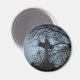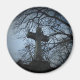 A beautiful and moody scene in a cmetery featuring a cross tombstone sheltered by tree branches on a magnet.