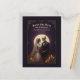 This gothic wedding save the date postcard features a skeleton couple wearing a wedding outfit with red roses and candles in a romantic setting in front of a lake at night with the moon in the background. The back of the postcard has the image of the skeleton couple and fill in your wedding details. Image generated with AI.