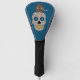 This awesome golf driver cover features a creepy grey skull with glowing blue eyes and rotting yellow teeth. On top of the skull is a brown rat with pink ears, tail, paws and nose and blue eyes, The rat has an arched back ready to leap out at you. A great design for rat lovers and for Halloween.