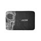 Skull head close up Gothic grunge black and white creative texture design custom printed name bathroom mat. Unique, cool, trendy, modern, scary vintage style home decor. Image copyright Marg Seregelyi Photography.