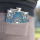 A skull image is framed with an ornate gothic style design and placed in a pattern that covers the surface of this unique flask. The pattern is placed on a gradient royal blue background.