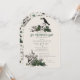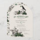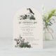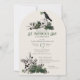 This elegant gothic St. Patrick's Day celebration invitation features hand-drawn Irish & gothic themed illustrations in black ink, showcasing a 2 skulls and a black crow adorned with green roses, leaves, berries, wildflowers and green clovers. The back features a beautiful pattern with these elements. Elegant soft green background.