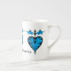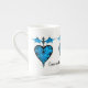 Elegant heart in black and blue and textured with a grungy mediaeval print has a bat winged fancy stake through it. I shaded one side of the design. Item will print clearer than shown. On a bone china mug. Add your name to both sides. Art (c) LR 2012 All rights reserved.