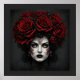 Capture the haunting beauty of gothic elegance with this striking poster featuring a mysterious woman adorned with deep crimson roses woven through her dark hair. Intricate, decorative patterns trace across her face, enhancing her ethereal and enigmatic aura. Her intense, forward gaze draws you in, creating a dramatic focal point perfect for lovers of dark romantic aesthetics. This artwork makes a stunning addition to gothic-themed decor, alternative art collections, or any space that celebrates moody, timeless beauty.