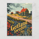 A captivating vintage portrayal of Gotland, Sweden's largest island in the Baltic Sea, known for its mediaeval architecture, scenic landscapes, and cultural heritage. The design features Gotland's iconic mediaeval city walls, picturesque countryside with windmills and farms, and the serene coastline dotted with historic fishing villages. Rendered in a nostalgic style, the artwork evokes the island's tranquil charm and historical richness, inviting viewers to explore its unique blend of natural beauty and cultural treasures.