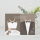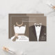 The perfect invitation for a Wedding Rehearsal Dinner or Post Wedding Brunch. The brown and taupe divided background hosts a white dress with a soft pink necklace and a man's tuxedo.