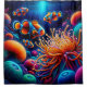 This vibrant design features three clownfish swimming gracefully among colourful coral formations. The clownfish, with their striking orange, white, and black stripes, stand out beautifully against the rich hues of the coral, which include shades of purple, blue, and orange, pink, and green. The dynamic composition and vivid colours create a lively and enchanting underwater scene. This artwork beautifully captures the whimsical nature of clownfish and the vibrant biodiversity of coral reefs, making it a perfect addition to any aquatic-themed decor. The intricate details and rich colours create a visually striking and harmonious composition, ideal for enhancing the beauty of any space.