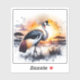 A crowned crane stands majestically in a vibrant landscape during sunset. The sky is painted with warm hues as birds fly in the background, creating a serene and picturesque atmosphere filled with splashes of colour and unique textures.