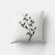 This black and white pillow features the silhouettes of grackles perched on a tree branch.