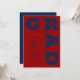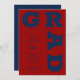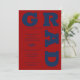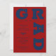 GRAD in bold blue lettering curves around the edges of these dark red graduation party invitations. SEE THE ENTIRE COLLECTION of pre-done colours, paper plates, napkins, and more in our store.
