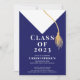Start off your event right with our trendy & stylish white grad cap & gold tassel with a blue background graduation party invitation. Perfect graduation invitation for a high school graduation or college graduation. Just fill in your information add your photo and you're all set to go. Visit our shop to view this graduation invite in a large assortment of school colours