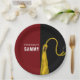 Creative graduation party plates featuring classic black and gold graduation cap on a maroon background. Edit text to add his or her name.