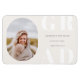 Rounded photo frame, senior class graduation announcement magnet. Soft ivory beige background, white bold type "GRAD" and coordinating grey text template lines for graduate's name, class of year and school.