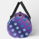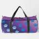 This stylish duffel bag showcases a captivating gradient patterned bag blending shades of purple and blue, adorned with coloured paw prints in lighter blue. It's a practical pet accessory and functional travel gear for everyday use.