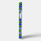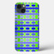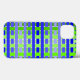 This phone case has a geometric design of lines in shades of blue and green woven to make a plaid.